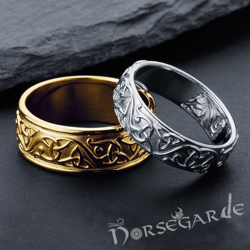 Fall in love with our Handcrafted Celtic Heart Band! Made from gold, this ring features a Triquetra knot with a heart centerpiece, and side art decorations inspired by Celtic art. Choose from a slim version or a thicker version with rims. Experience the intricate craftsmanship and timeless design of this beautiful ring. For more information on how to accurately measure your finger size, please refer to our Ring Sizing Guide.