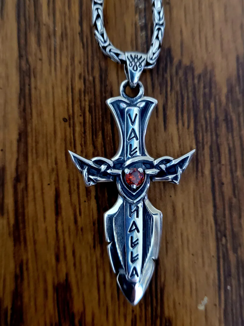 Made from genuine 925 Sterling Silver, this handcrafted dagger pendant features a Celtic knot hilt and "Valhalla" inscribed along the length of the blade. Boasting a double-sided design with a cubic zirconia gem adorning the hilt, the pendant is a bold addition to your collection.