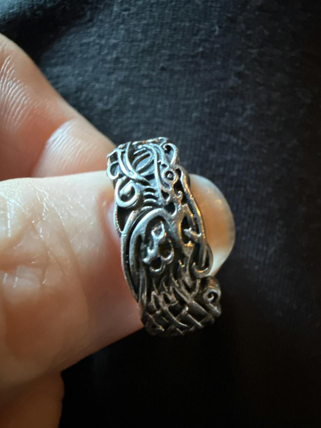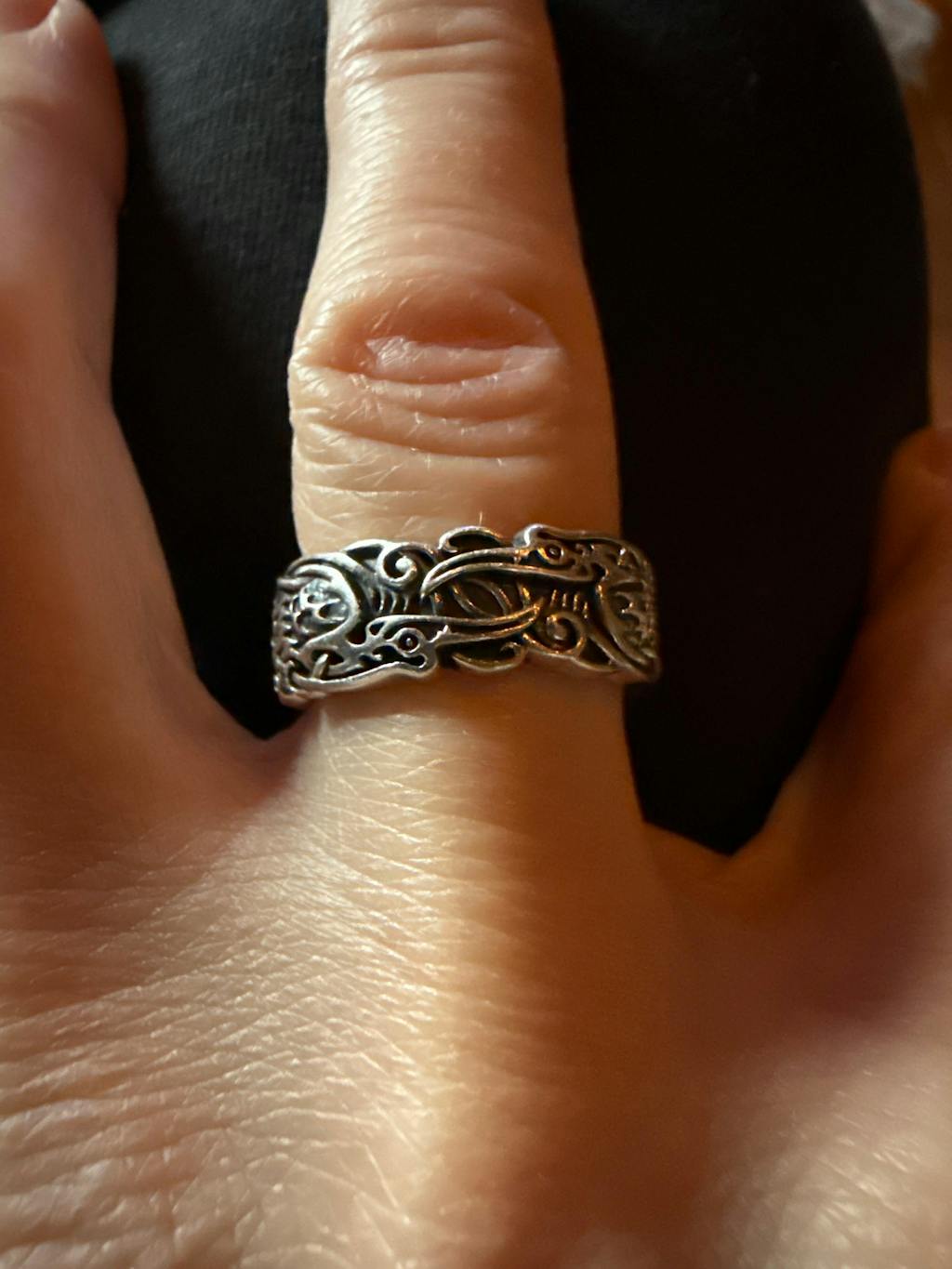 Genuine handcrafted 925 Sterling Silver ring with Norse art stylized Odin's ravens engraved along the band of the ring. This ring is smoothly polished on the inside for comfortable wear, and comes in a variety of sizes. For more information on how to accurately measure your finger size, please refer to our Ring Sizing Guide.
