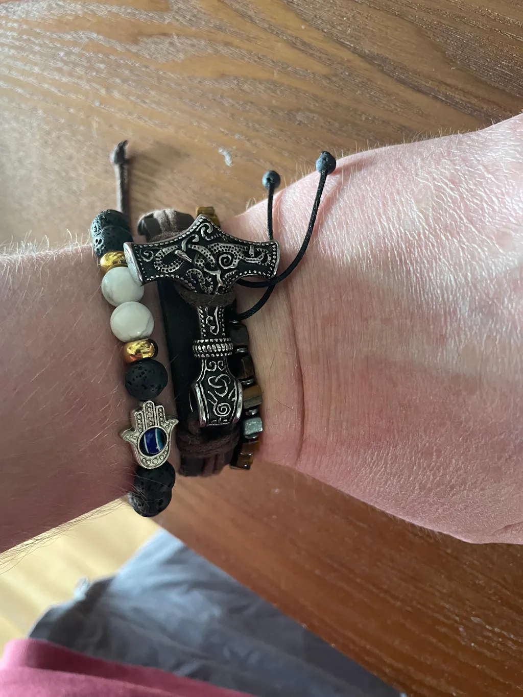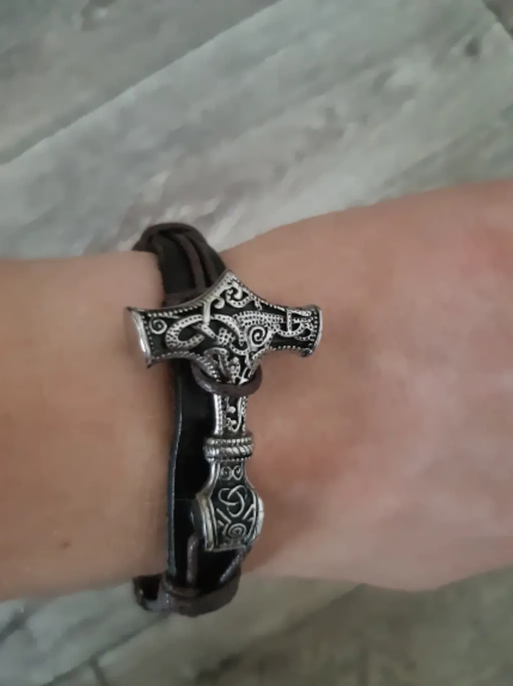 Stylish and comfortable leather bracelet with Mjölnir the Thor's Hammer charm as its centerpiece. The bracelet is adorned with a brown rope that functions as a unique sizing mechanism and can be easily secured onto the wrist with a customizable strap.