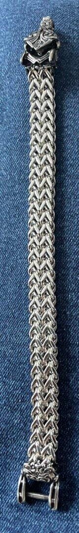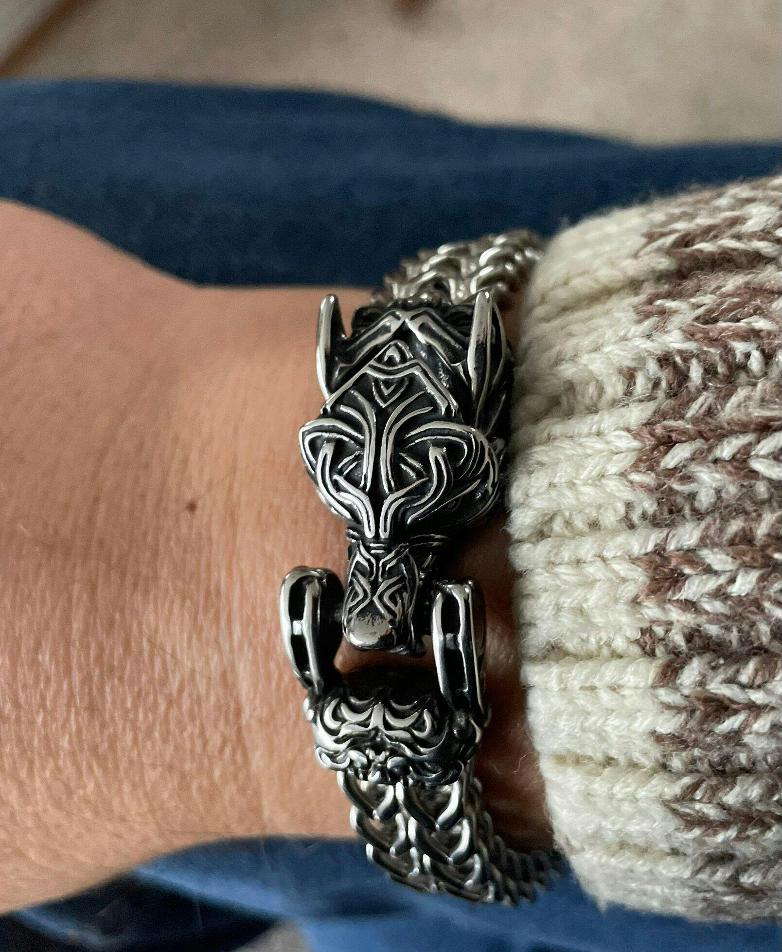 Heavy stainless steel chain bracelet, meticulously crafted with Celtic ornamentation of a Fenrir wolf head biting into its own tail. The ouroboros bracelet is secured with an innovative spring clasp made to resemble a wolf's maw that locks into a hatch on the other end of the bracelet. Available in a range of sizes, this bracelet is designed for comfort when being put on or taken off. For more information on how to accurately measure your bracelet size, please refer to our Bracelet Sizing Guide.