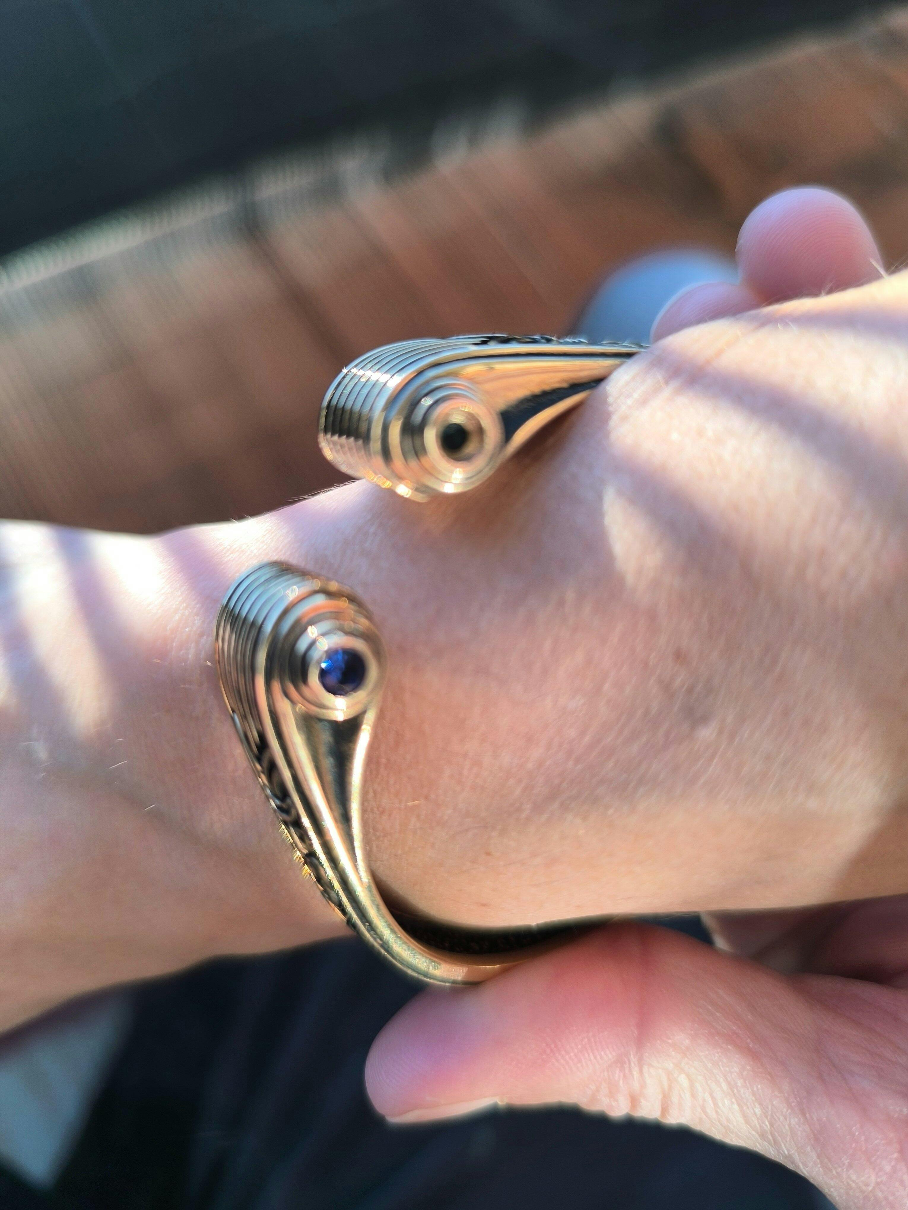 Genuine handcrafted Bronze Viking Arm Ring made in traditional torc bracelet shape with Viking inspired art depicting Odin's warriors in the halls of Valhalla. The size of this bracelet can be adjusted by firmly pulling the bracelet apart or together until the desired size is reached. To avoid damaging the bracelet while adjusting, it is recommended to apply size adjustments slowly and to not exceed the product size limitations. Frequent adjustments may harm the bracelet. For more information on proper adjusting and wearing of this bracelet, please refer to our Cuff Bangle & Torc Bracelet Wear Guide.