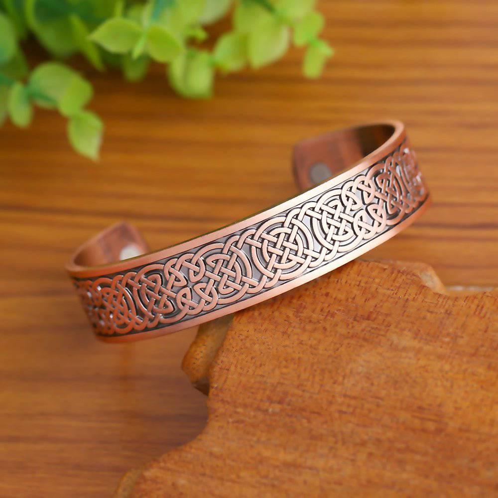Traditional style Celtic bangle with Celtic Luck knot pattern and magnetic cuffs. The size of this bracelet can be adjusted by firmly pulling the bracelet apart or together until the desired size is reached. To avoid damaging the bracelet while adjusting, it is recommended to apply size adjustments slowly and to not exceed the product size limitations. Frequent adjustments may harm the bracelet. For more information on proper adjusting and wearing of this bracelet, please refer to our Cuff Bangle & Torc Bracelet Wear Guide.
