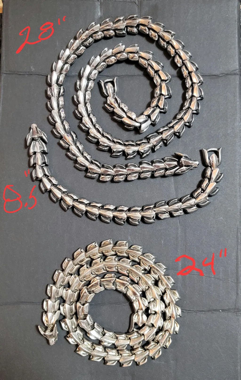A unique imposing stainless steel necklace inspired by the world serpent Jormungandr that by legends encircles the world. Made with sturdy stainless steel scales, this necklace is a bold and eye-catching piece to add to your outfit. This necklace is available in several sizes, and is easily secured put on and taken off with a unique design bite clasp.